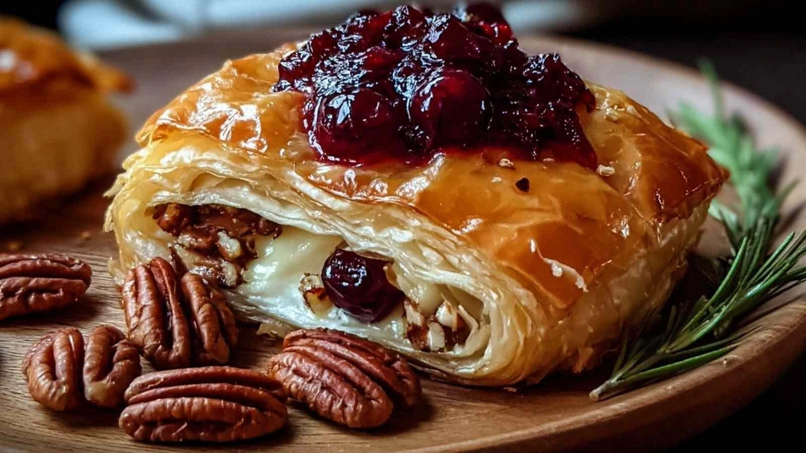 Picture this: the puff pastry is pulled apart, the air hissing as the dough expands in my hands. The Brie sits like a molten gold heart, its creamy interior begging to mingle with the tart cranberry sauce. The pecans crackle with a nutty perfume that fills the kitchen, while the honey drizzles like liquid sunshine. The rosemary sprigs add a green, herbal note that ties everything together. I can almost taste the first bite—crisp edges that shatter like thin ice, a burst of sweet, savory, and herbal flavors that dance across my palate.