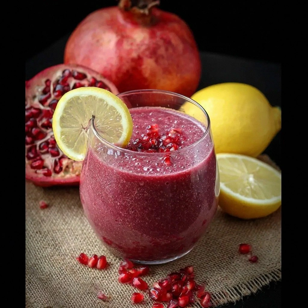 Imagine a glass that glistens like a clear, sun‑kissed lake, its surface speckled with ruby pomegranate seeds that pop with a burst of sweet‑tart juice whenever you take a sip. The aroma that rises from the blender is a bright, citrusy perfume, mingled with the deep, earthy fragrance of freshly crushed pomegranate. As the mixture whirls, the sound is a satisfying hiss, like a gentle waterfall cascading into a crystal bowl. The first taste is an instant explosion of tangy lemon that instantly wakes up the palate, followed by the subtle, almost floral sweetness of the pomegranate that lingers like a delicate after‑taste. The texture is luxuriously smooth, with a slight, natural thickness that feels like a velvety smoothie but with a refreshing bite. The final touch, a sprinkle of crushed pistachios, adds a crunchy contrast that dances against the silky liquid.